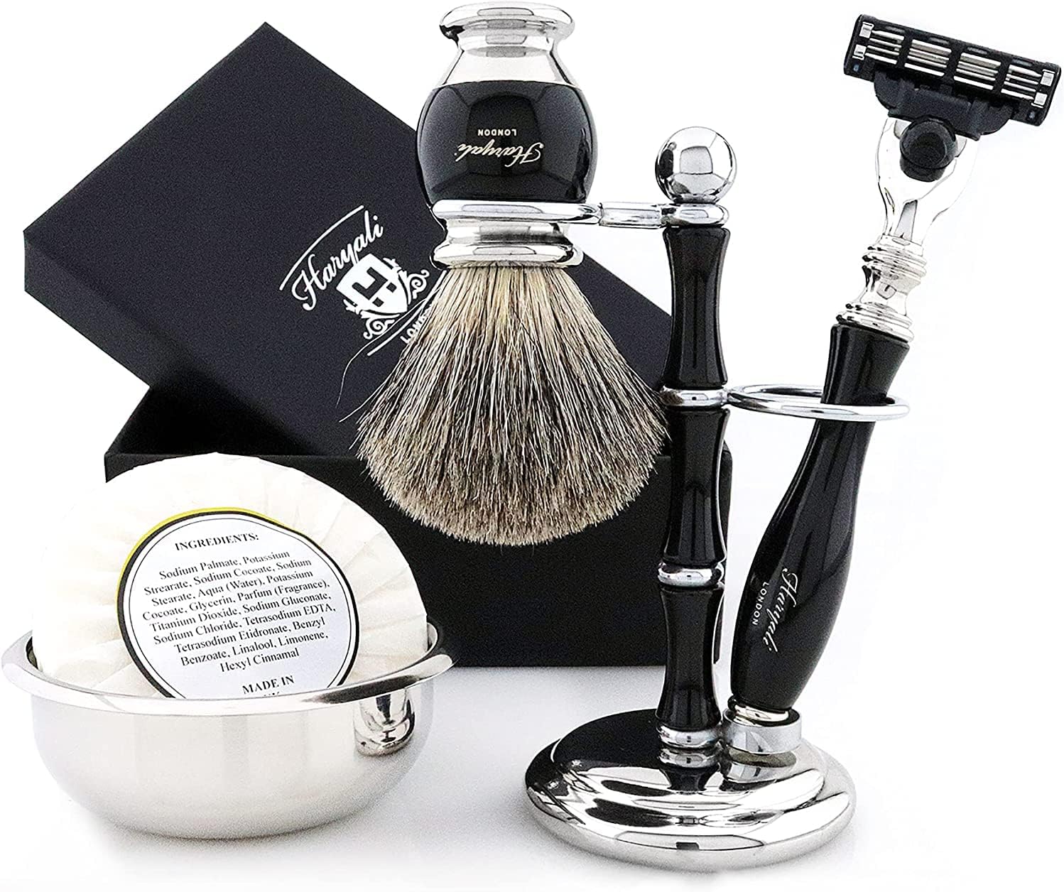 - Rasierpinsel-Set für Herren und Damen in Schwarz: Dieses klassische schwarze Rasierset enthält einen Rasierpinsel aus Dachshaar, eine Schale und einen Ständer aus Edelstahl, ein Rasiermesser mit drei Klingen und eine schaumreiche Rasierseife.