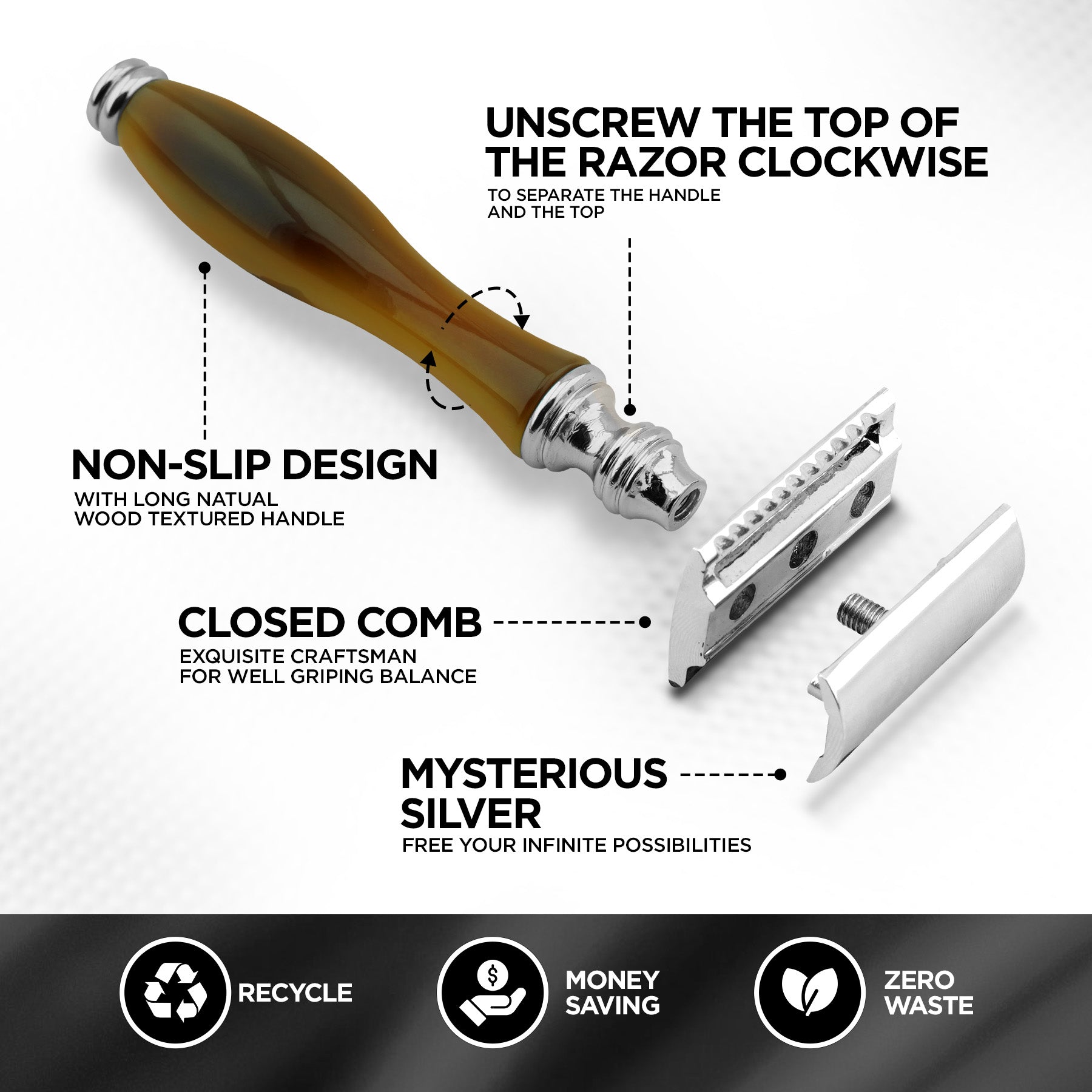 Dieser Rasierhobel mit Doppelklinge imitiert die klassische Hornverarbeitung und ist aus zweifarbigem Harz gefertigt, um den Vintage-Look zu verkörpern. Der ergonomisch geformte Griff mit perfektem Gewicht und Größe ermöglicht eine mühelose Rasur. Der geschlossene Kammkopf ist sicher und sowohl für Anfänger als auch für Experten geeignet. Dieser Rasierhobel von Haryali London gehört zu unserer Designlinie Vireo und ist mit allen gängigen DE-Rasierklingen kompatibel. Dieser Einklingenrasierer für Herren verfügt über einen Drehmechanismus für einen einfachen Klingenwechsel.