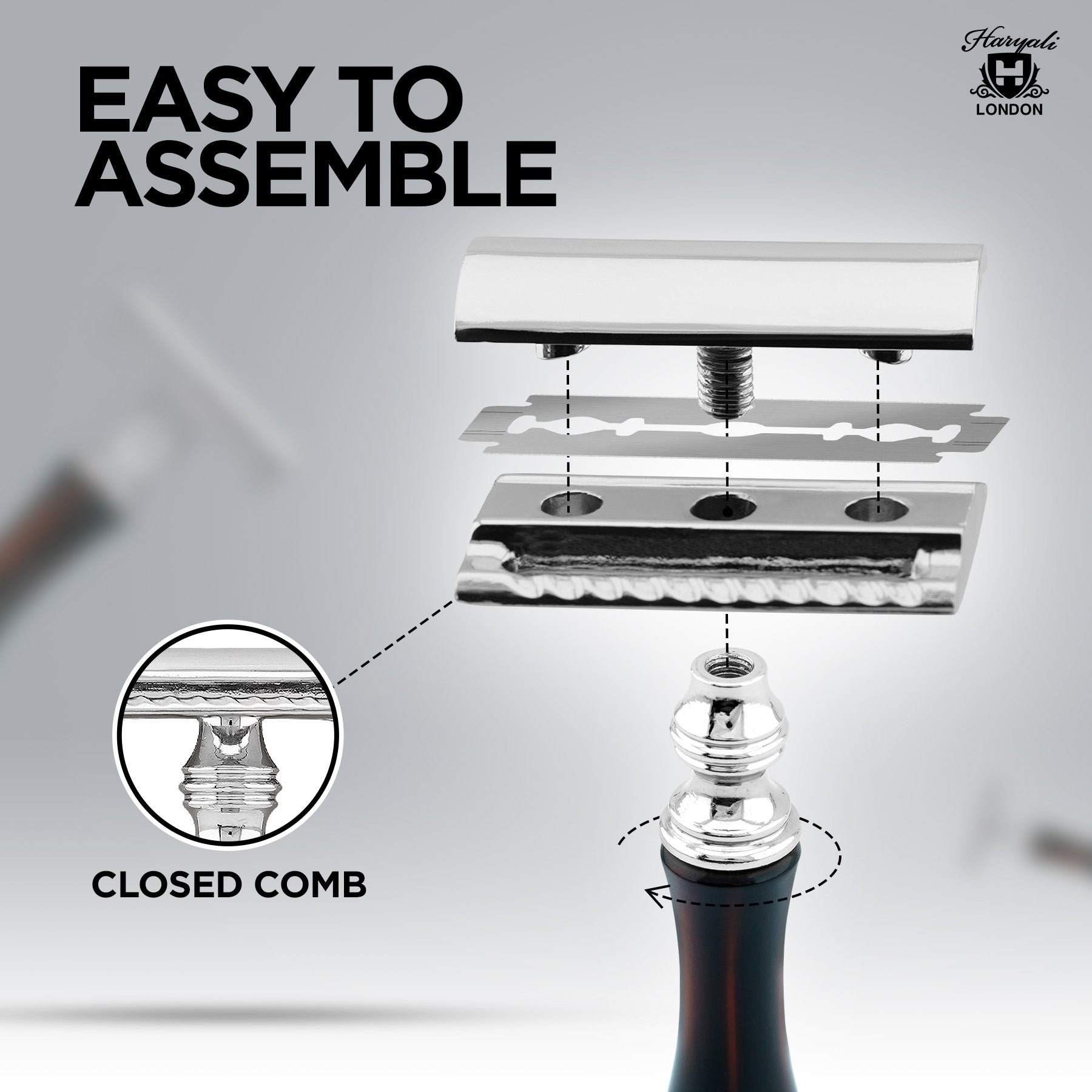 Dieser Rasierhobel mit Doppelklinge ist einzigartig in Rot- und Schwarztönen gefertigt und verfügt über einen ergonomischen Harzgriff, der wie Glas aussieht. Er ist komfortabel in der Anwendung und ermöglicht eine präzise, gründliche Rasur. Der Rasierkopf hat einen geschlossenen Kamm mit sanfter Klingenfreilegung und ist für alle Hauttypen geeignet. Er gleitet sanft über die Haut. Dieser Rasierhobel von Haryali London gehört zu unserer Designlinie Vireo und ist mit allen gängigen DE-Rasierklingen kompatibel. Dieser Einklingenrasierer für Herren verfügt über einen Drehmechanismus für einen einfachen Klingenwechsel.