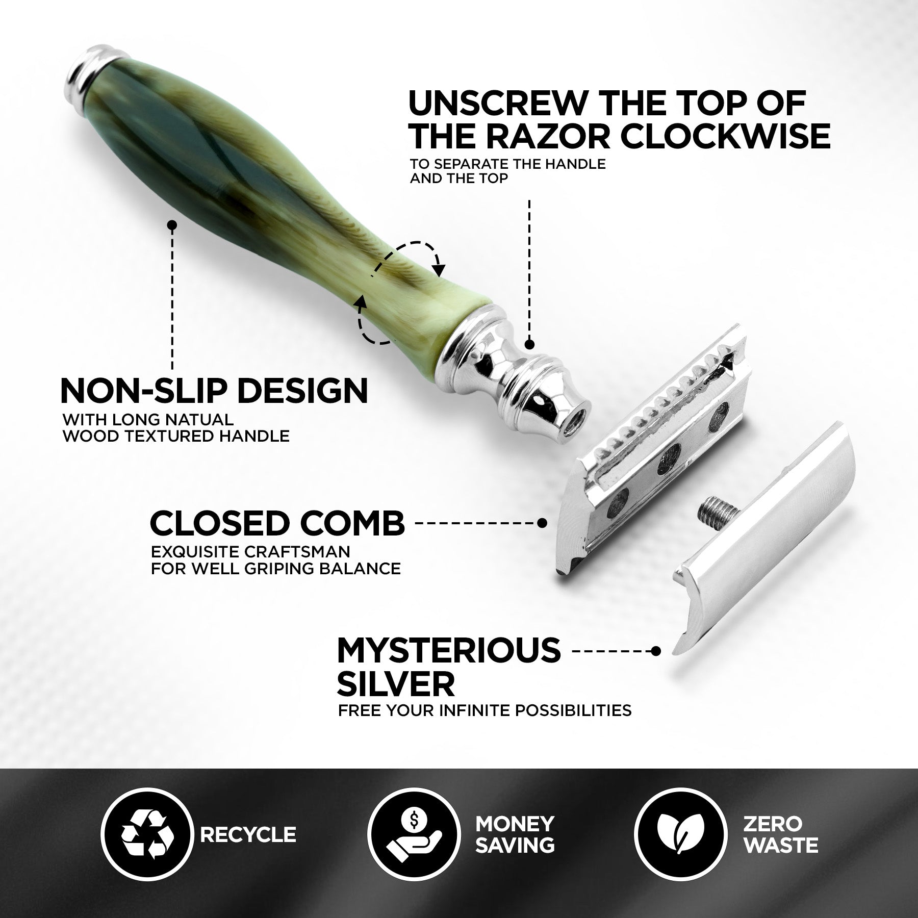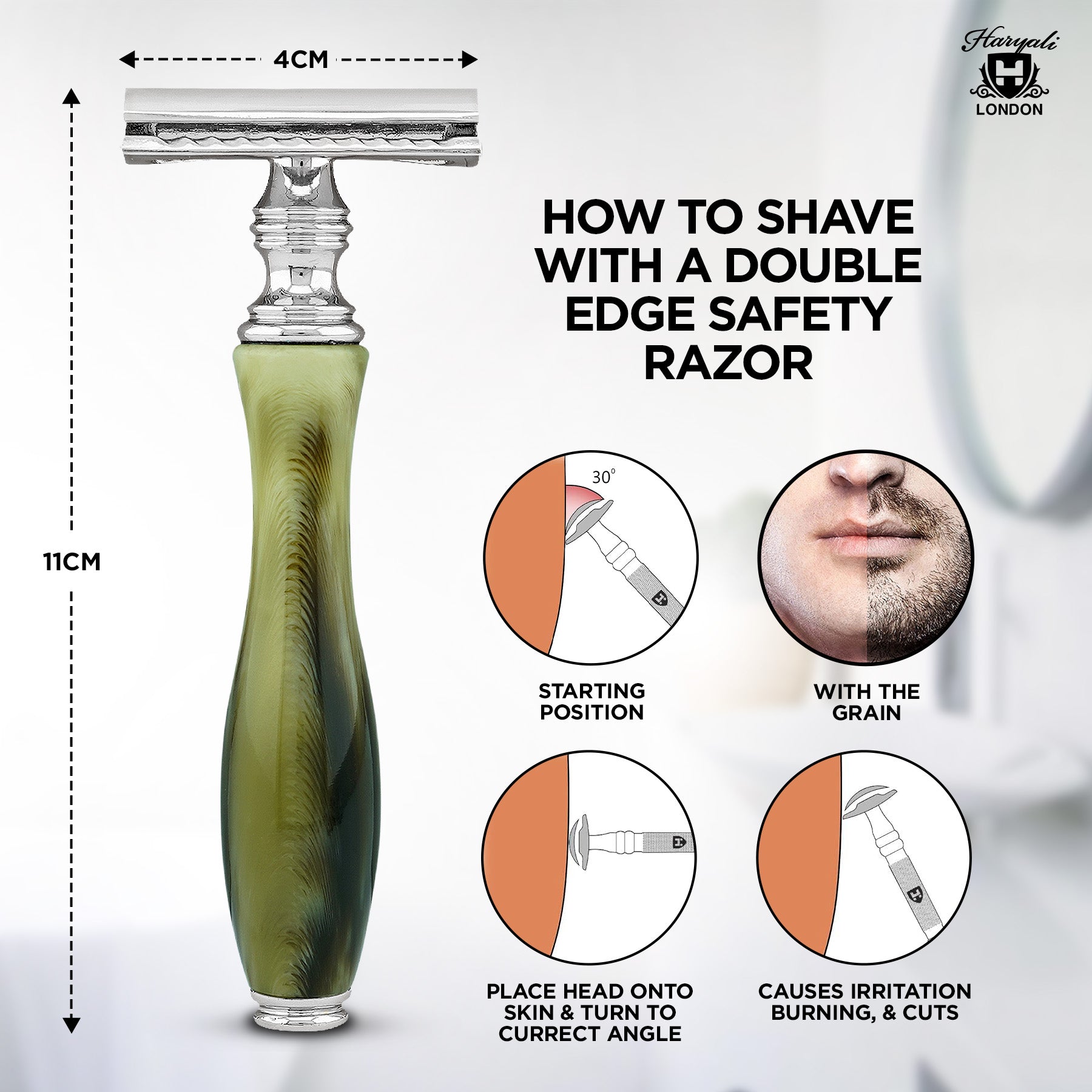Dieser Rasierhobel mit zwei Klingen imitiert die alte Hornkunst und besticht durch sein zweifarbiges Harzdesign im klassischen Look. Die perfekte Griffkrümmung sorgt für Präzision und Komfort bei der Nassrasur. Der geschlossene Kammkopf ermöglicht sicheres Arbeiten und eine sanfte Rasur. Dieser Rasierhobel von Haryali London gehört zu unserer Designlinie Vireo und ist mit allen gängigen DE-Rasierklingen kompatibel. Der Einklingenrasierer für Herren verfügt über einen Drehmechanismus für einen einfachen Klingenwechsel.